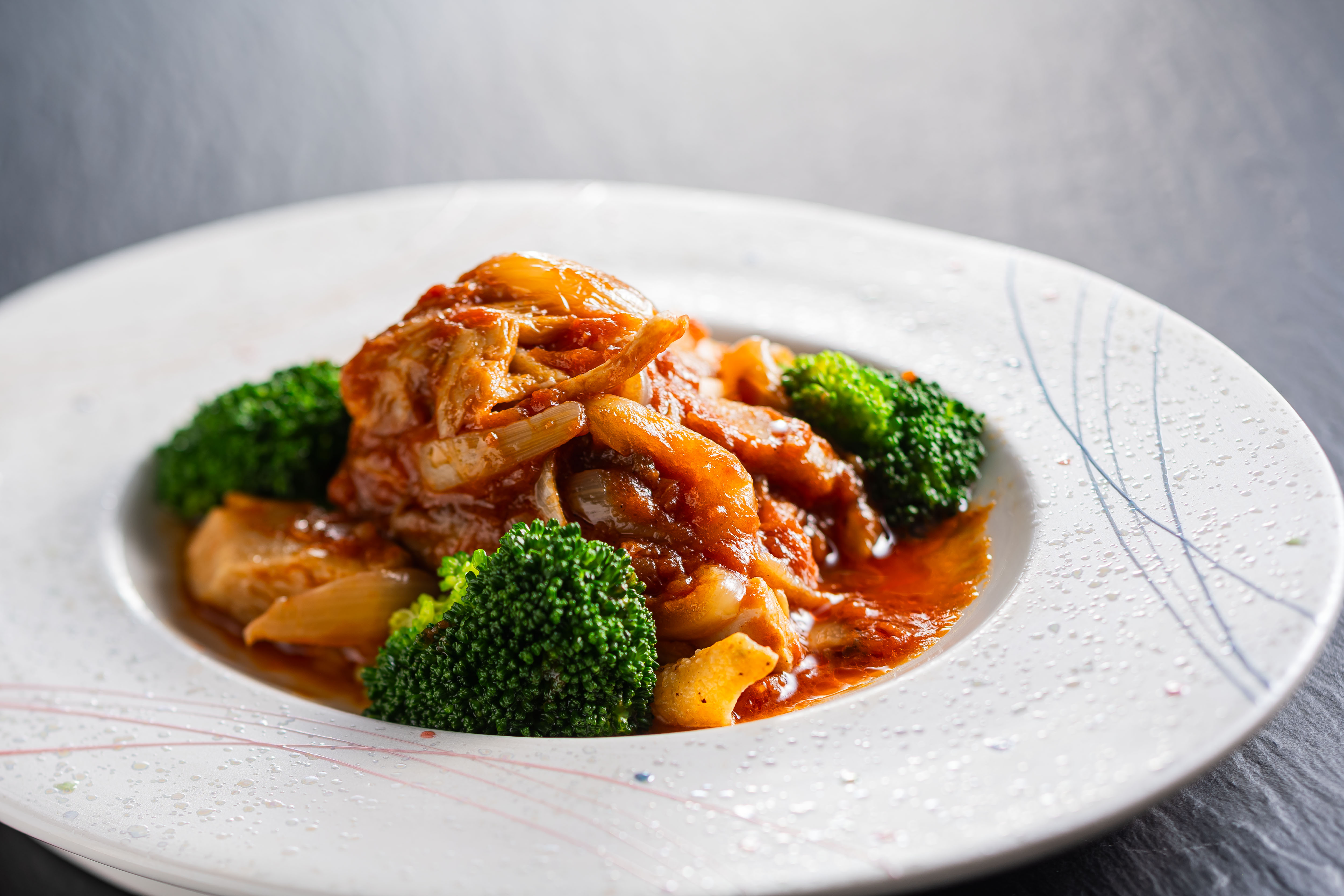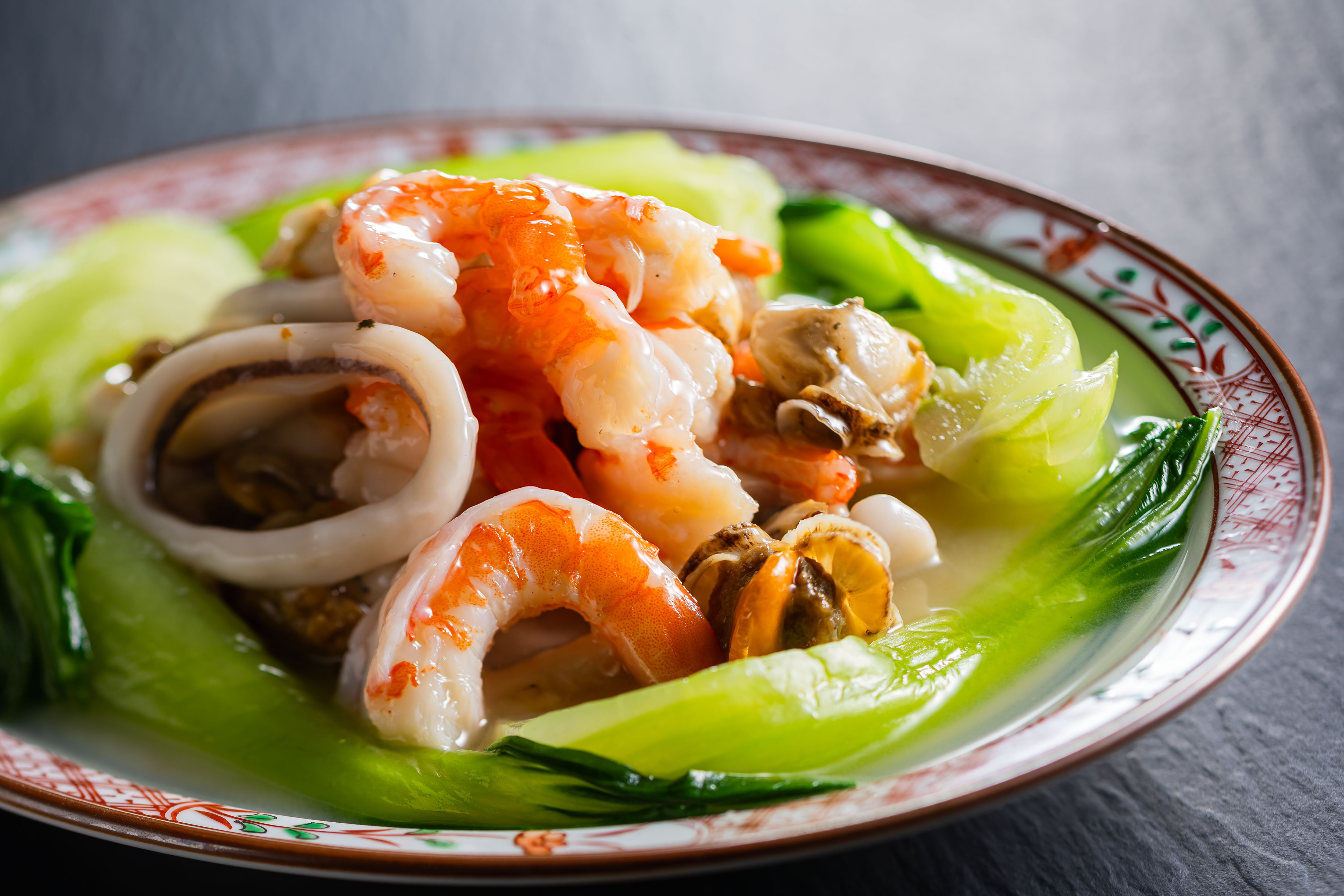海鮮(海老・烏賊・帆立)に生姜の香りをまとわせた、あっさりとした一品です。