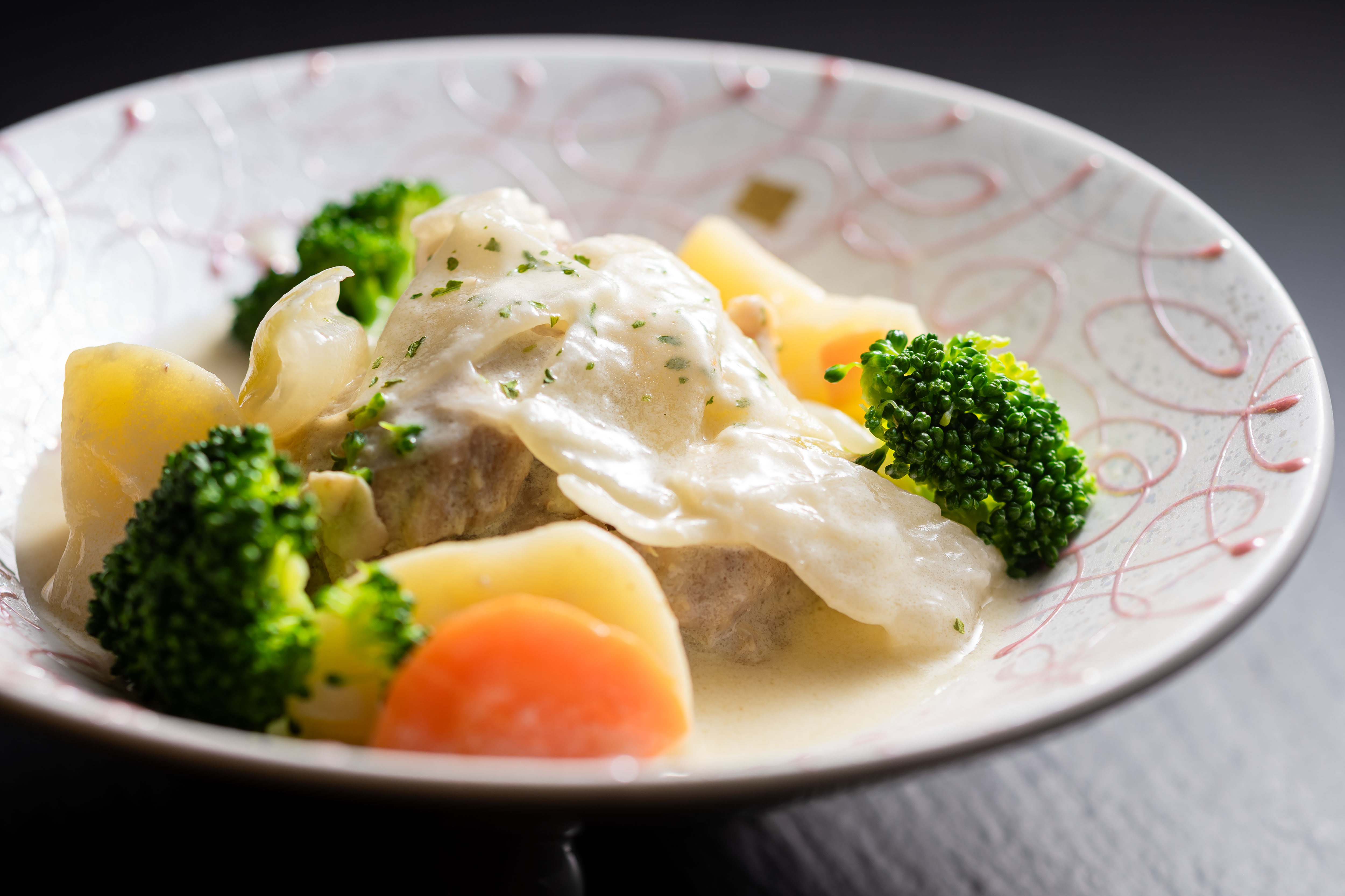 カリッと焼いた鶏ももと野菜・牛乳・生クリーム煮込みました。