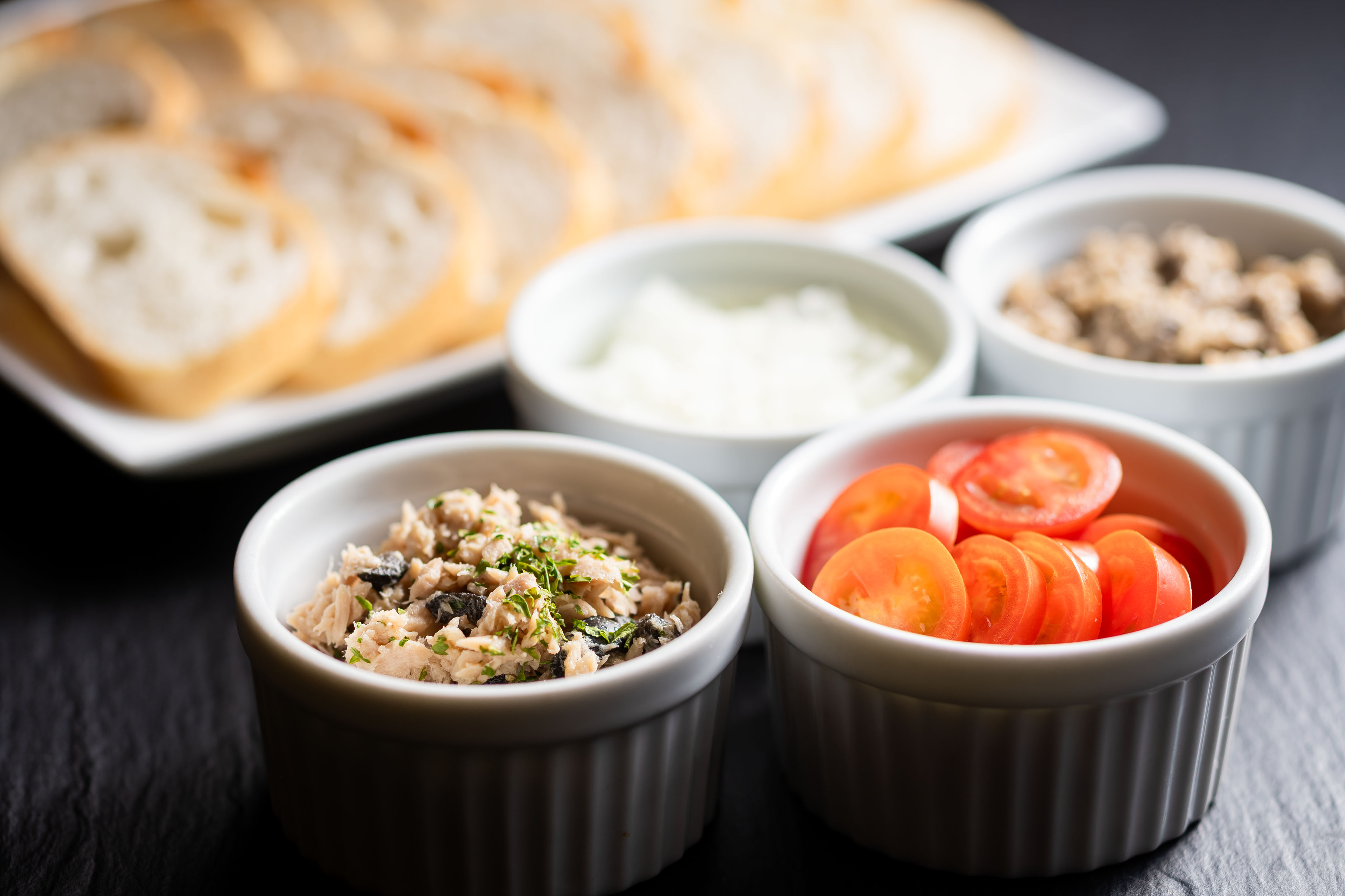 フランスパンにトリュフオイルとキノコ・シーチキン・野菜をのせて。ワインのお供に。