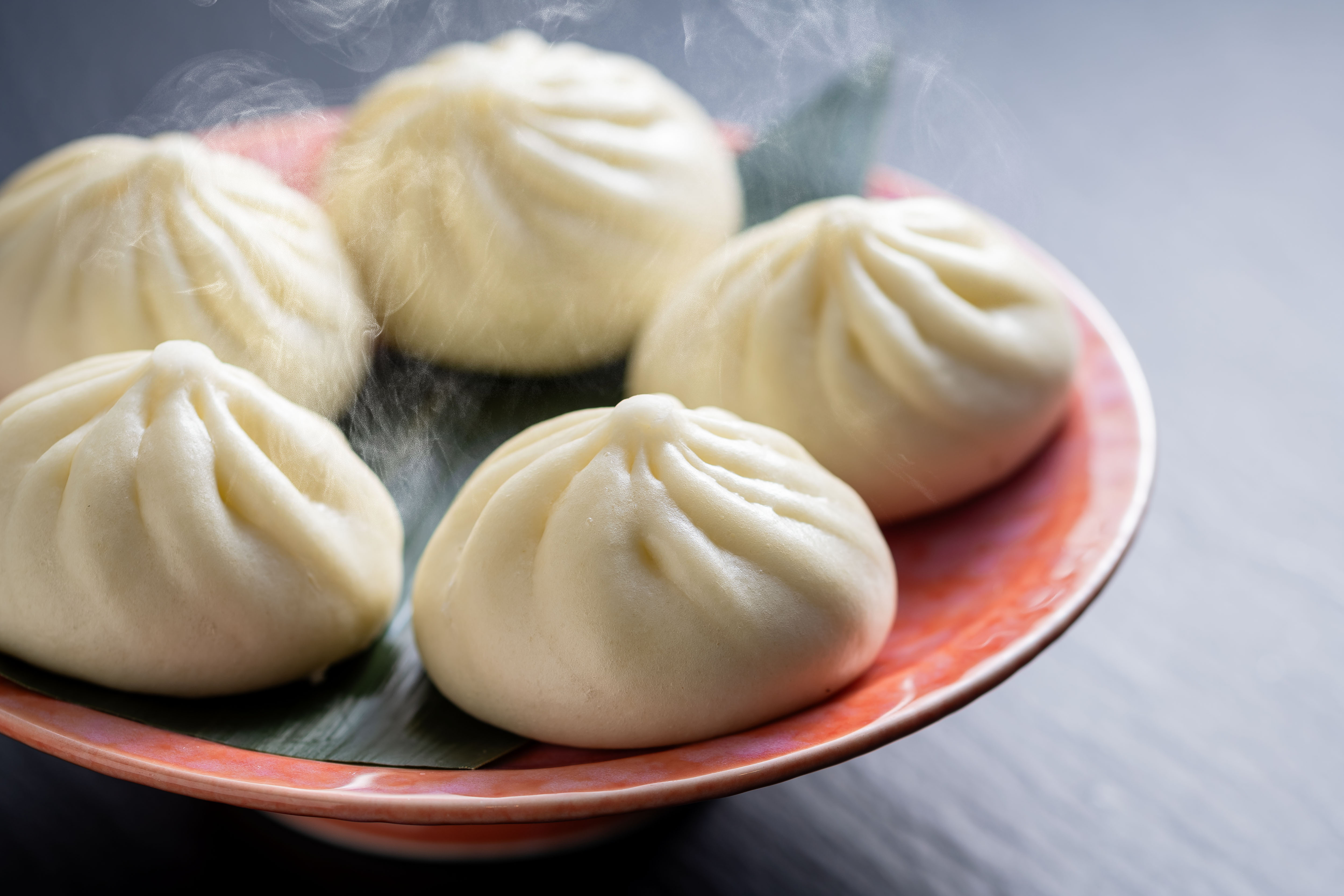 ホカホカの肉まん。お好みで水辛子をお付けください。