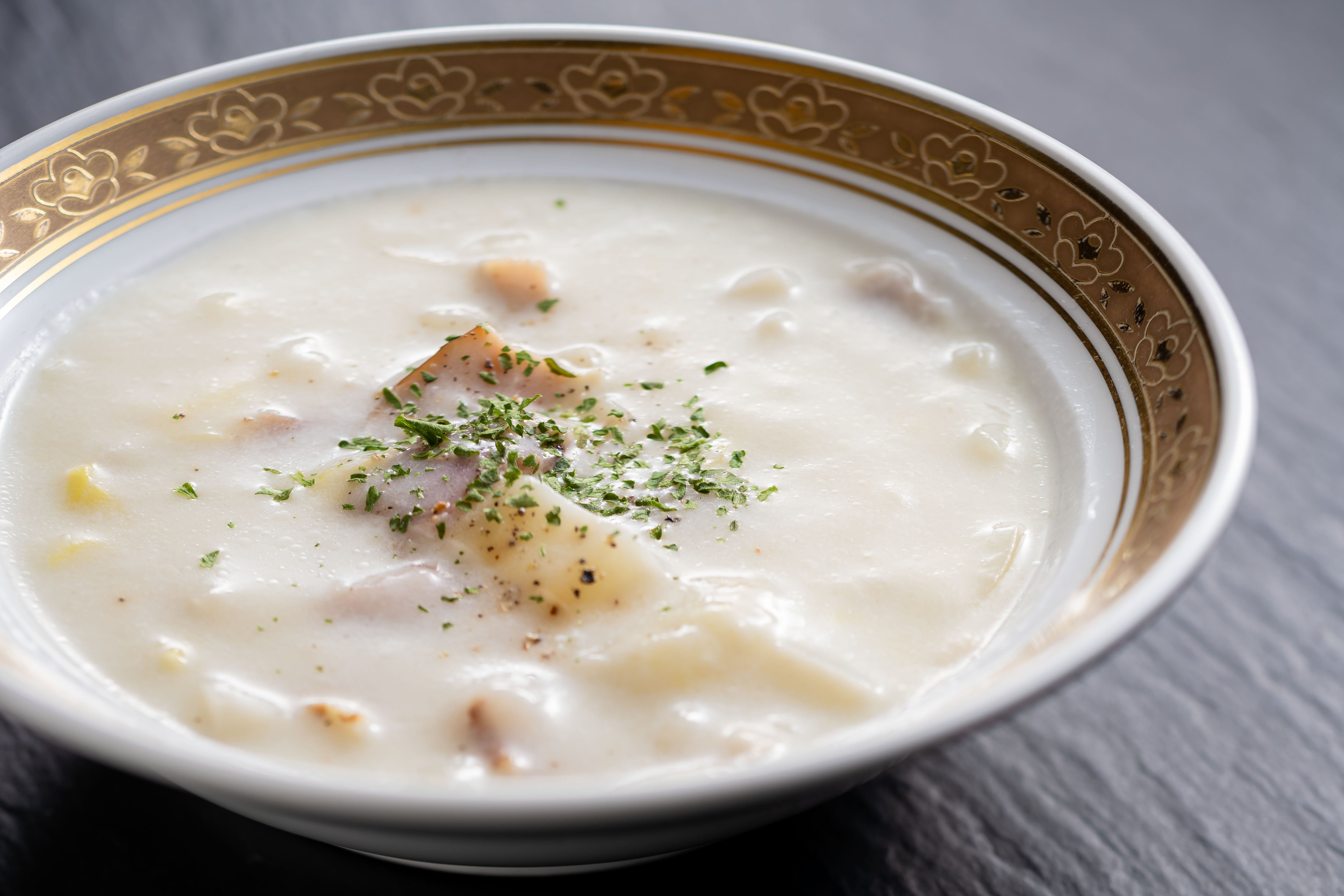 季節の野菜白菜にベーコンで味わい深く牛乳でこく深さ出し、冷えた体に染みこむ味に。