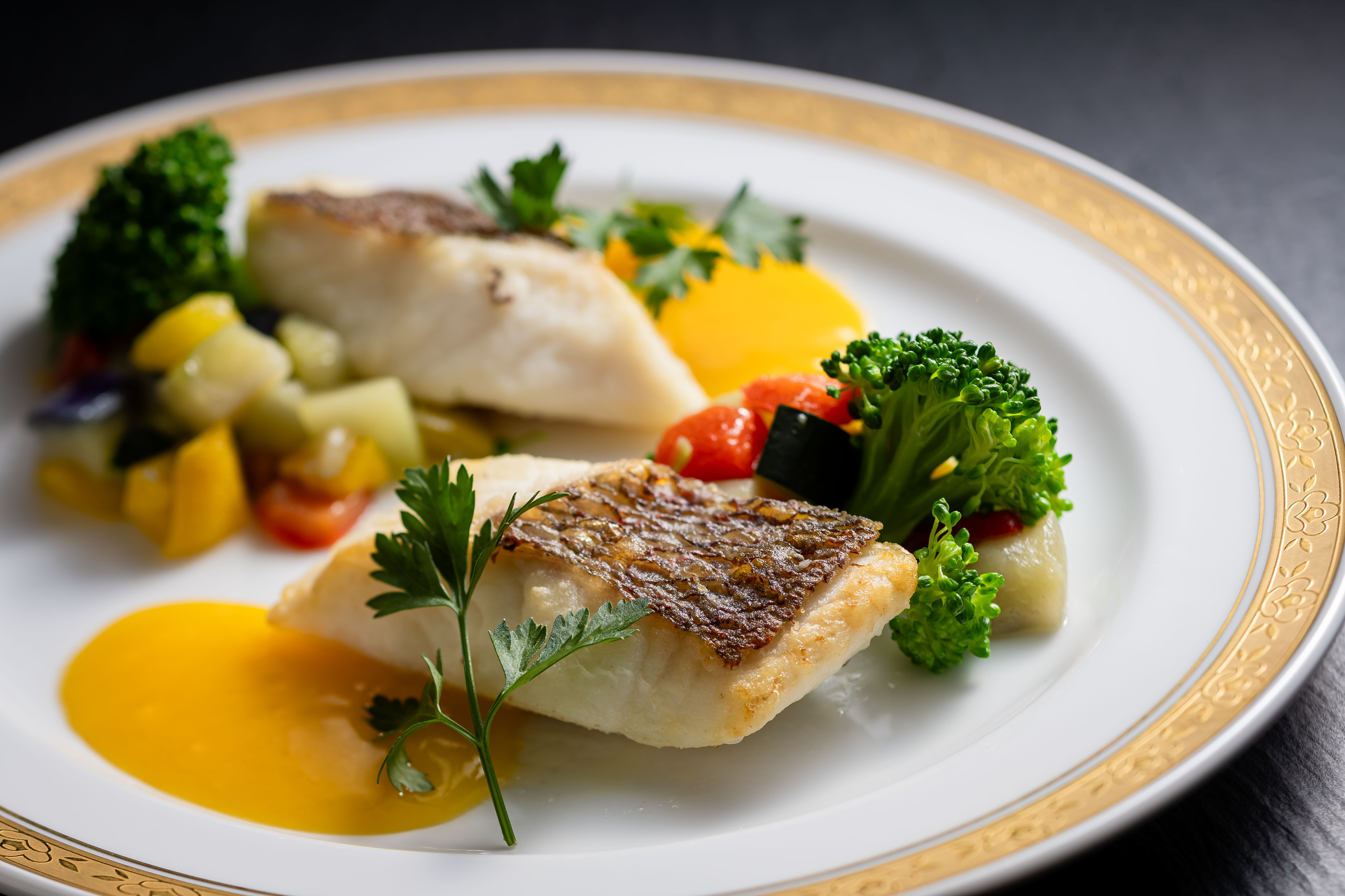 カリッとポアレした鯛を愛媛県温州ジュースを甘酸っぱく煮つめたソースかけておめしあがりください。