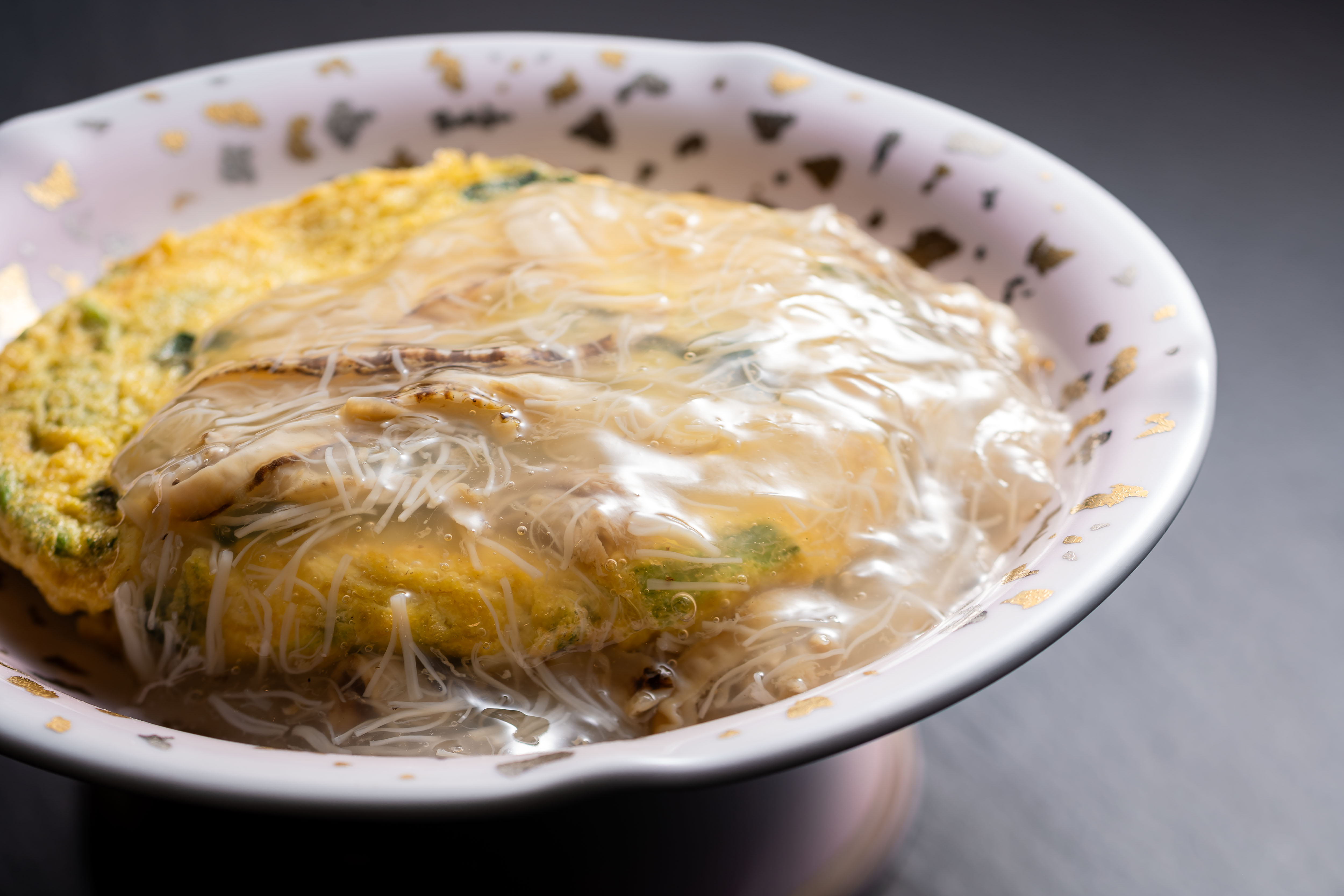 柔らかく焼き上げた美蓉(中華風オムレツ)に海鮮のホタテで味を整えた一品です。あっさりと塩味に仕上げてます。